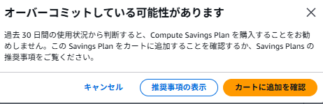 Savings Plansの購入画面では、割引の恩恵がない場合に「オーバーコミットしている可能性があります」と表示してくれます。