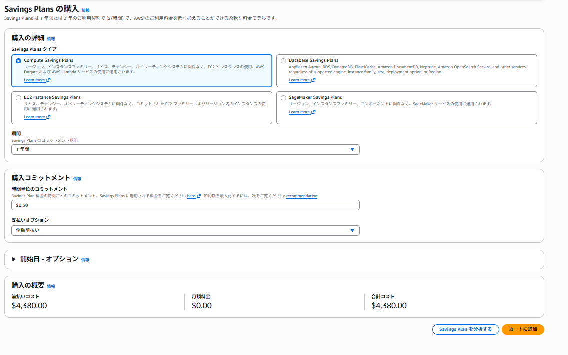 | プランタイプ | Compute Savings Plans / EC2 Instance Savings Plans | Compute SPが最も柔軟性が高い |