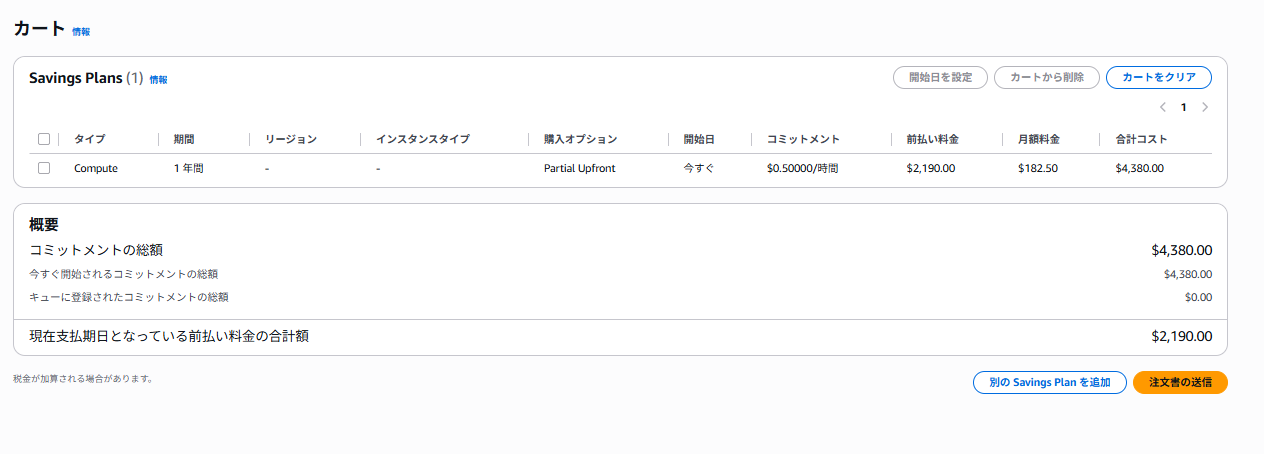 | 時間あたりのコミットメント額 | 例: $0.50/時間 | AWS Pricing Calculatorで事前に試算可能 |