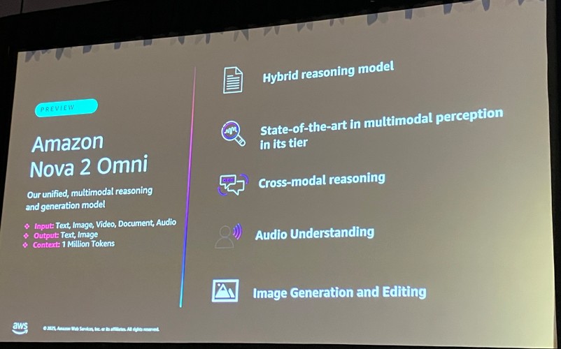 今年のキーノートでも大きく注目を集めたのは、AWSが満を持して投入した次世代基盤モデルファミリー「Amazon Nova 2」の発表でした。