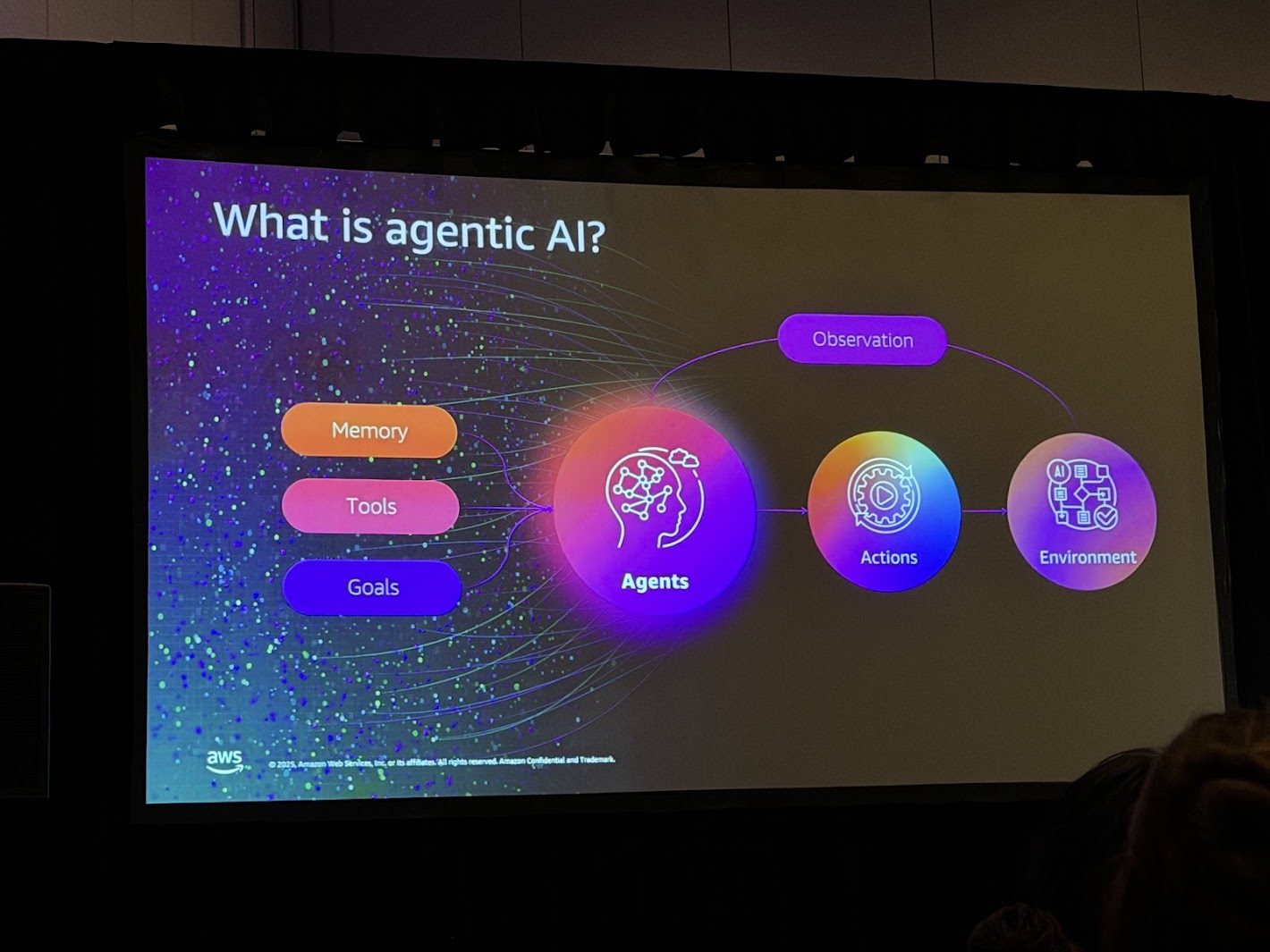 AWS re:Inventにおいて繰り返し強調されたテーマの一つが「Agentic AI(自律型AIエージェント)」の台頭です。従来の大規模言語モデル(LLM)を用いたチャットボットは、ユーザーからの質問に対して受動的に応答する存在でした。これに対し、Agentic AIは、より能動的かつ自律的な振る舞いを見せます。Chalk TalkのスピーカーであるVenkata Sistla氏(Sr. WW Specialist SA - AI/ML)は、エージェントを「自律的に行動(Act)、計画(Plan)、実行(Execute)できる存在」と定義していました。