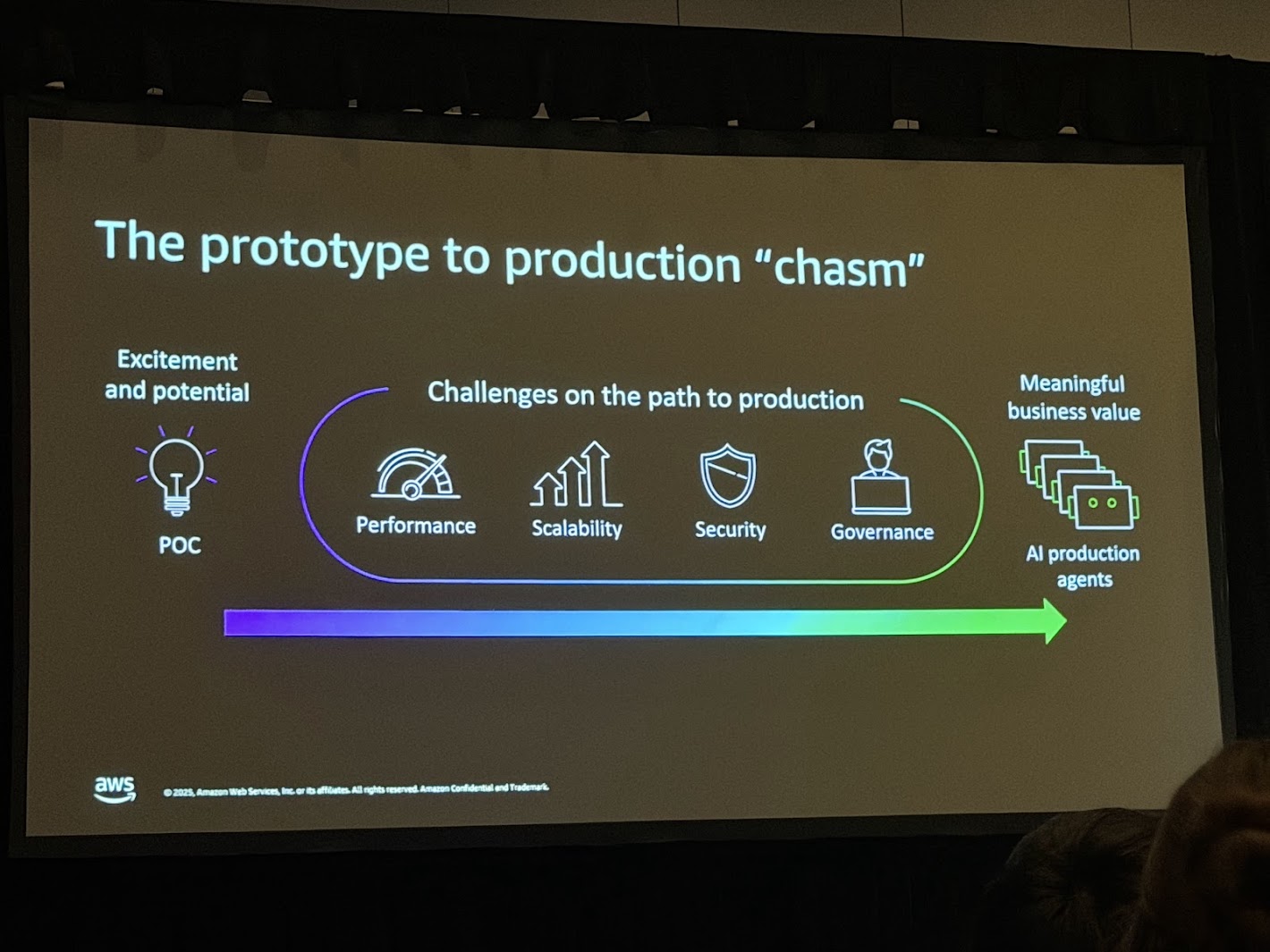 現在、多くの組織が生成AIのプロトタイプ作成(PoC)から本番環境への移行という「キャズム(深い溝)」に直面しています。このキャズムを乗り越えるための鍵として、AWSは2つの革新的な技術パラダイムを提示しました。