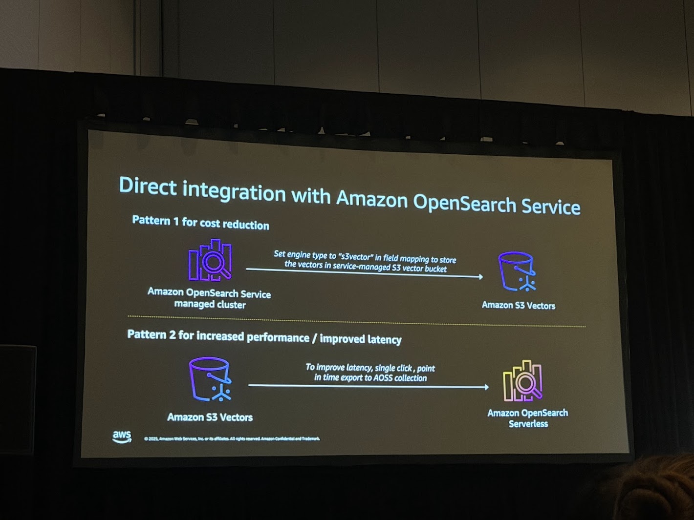 S3 Vectorsは単独でも利用可能だが、より高度な検索要件に対応するために、Amazon OpenSearch Serviceとの深い統合機能が提供されています。Chalk Talkでは、以下の2つの主要な統合パターンが提示されました。