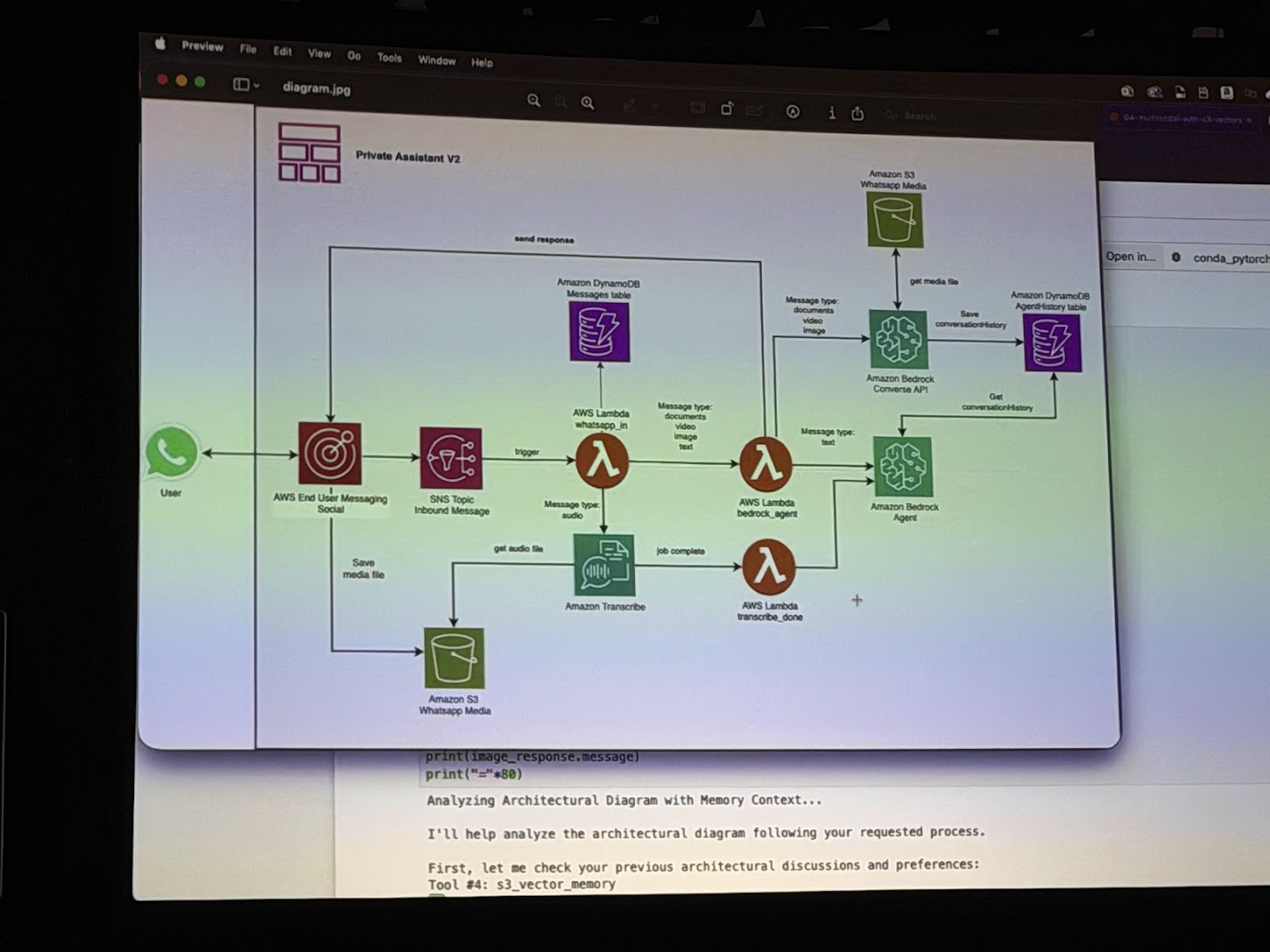 ユーザーがAWSのアーキテクチャ図(画像)をアップロードする。エージェントはマルチモーダルモデルを使用して画像を解析し、「Private Subnet、DynamoDB、Lambda、S3 Bucket、Bedrockが含まれている」といった構成要素を認識する。さらに、メモリ内に過去の類似したアーキテクチャ議論がないかを確認し(Retrieval)、新たな洞察を加えて応答する。 - ドキュメントとの照合:
