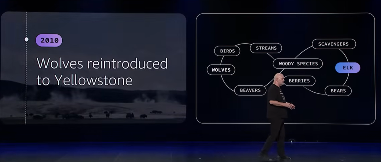 講演では、生態学の有名な事例である イエローストーン国立公園のトロフィック・カスケード が紹介されました。