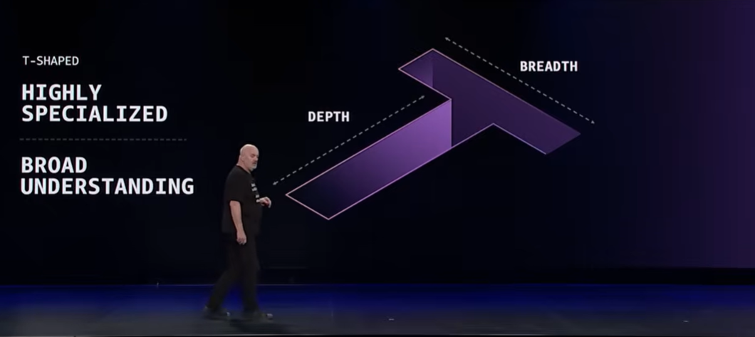 Werner が推奨するのは、深い専門性(I 字) × 広い知識の幅(-)を持つ T 字型の開発者 です。