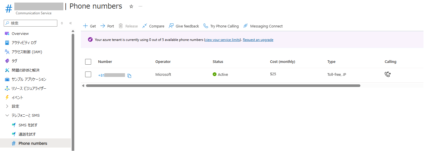 ※電話番号を取得するには、「有料の Azure サブスクリプション」が必要となります。試用アカウントや 無料クレジットで電話番号を取得することはできません。