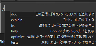 GitHub Copilot Chatは、スラッシュコマンド(/)やチャット変数(#)を利用することで、特定のタスクを素早く実行できます。