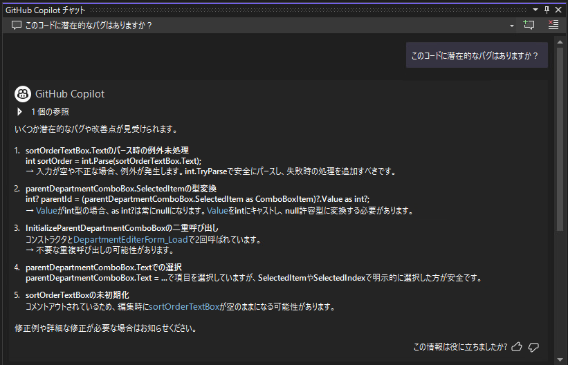 エラーが出ていない場合でも、「このコードに潜在的なバグはありますか?」と尋ねることで、パフォーマンスのボトルネックやセキュリティの脆弱性などを指摘してもらうことができます。