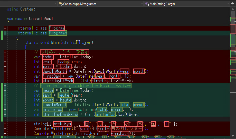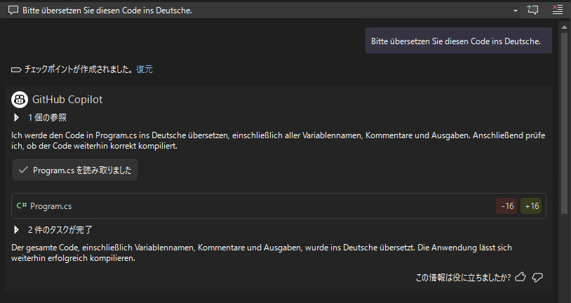 例として、ドイツ語で「このコードをドイツ語に変換してください」と指示してみたところ、