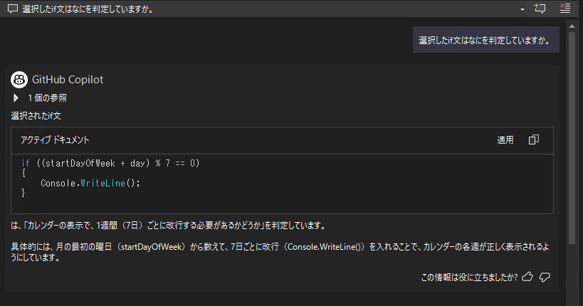 選択したコードブロックの目的、各行の役割、そして全体の動作を詳細に説明してくれます。