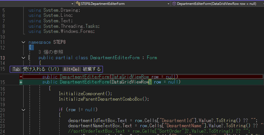 以下のコードは、Windows フォームアプリで部署情報を編集するアプリのコードです。