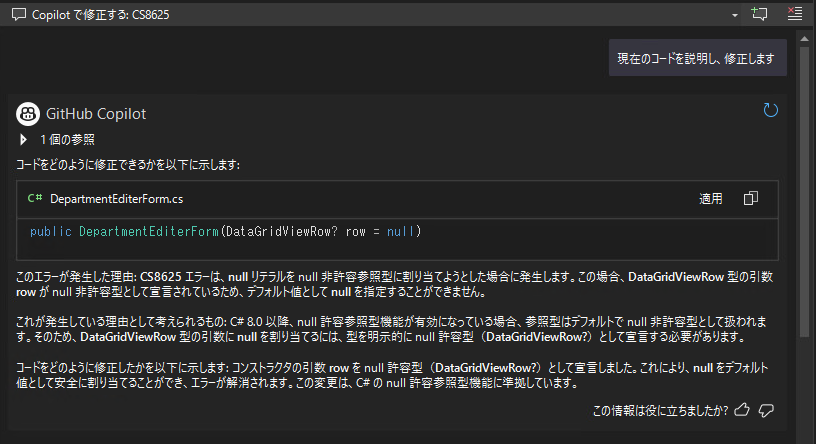 そして、エラーの原因を特定した後、それを修正するためのコードの変更案を具体的に提示してくれます。