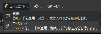 また、GitHub Copilot Chatには「質問」、「エージェント」の2つモードがあり、状況に応じてモードを変更し、使い分けることができます。