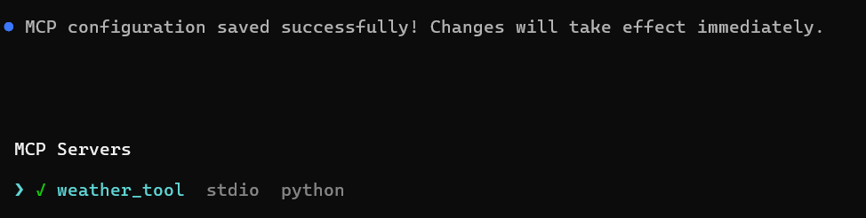 「MCP configuration saved successfully!」と表示され、stdio として登録されれば成功です。これで再起動なしですぐに使用可能になります。