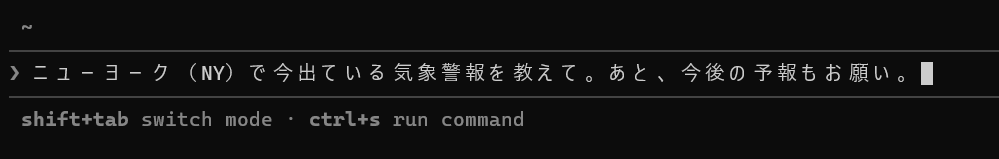 今回は「ニューヨーク(NY)で今出ている気象警報を教えて。あと、今後の予報もお願い。」と質問してみました。