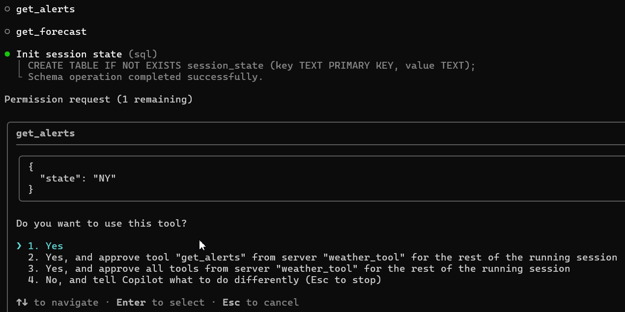 実行の許可(Do you want to use this tool?)が求められるので、「1. Yes」を選択して承認します。