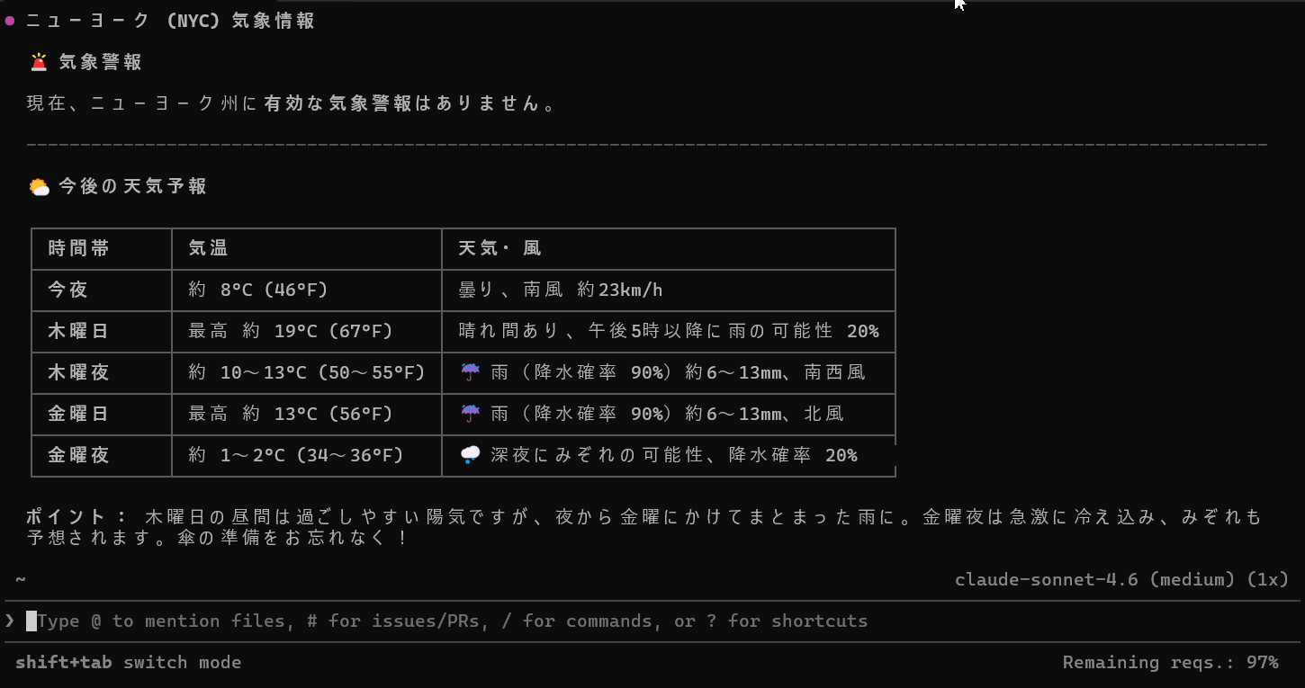 ツールから無事にニューヨークの天気データが取得でき、気象警報の有無に加えて、今後の天気予報が気温や天気、風の強さが表形式で出力されました。