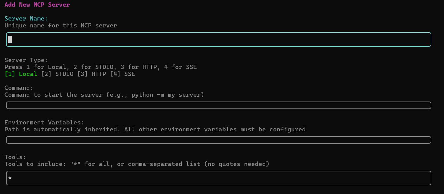 CLIの対話モードが立ち上がったら、続けて /mcp add コマンドを入力して設定フォームを開きます。