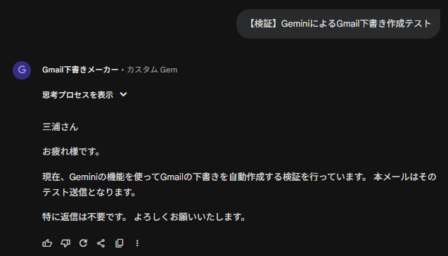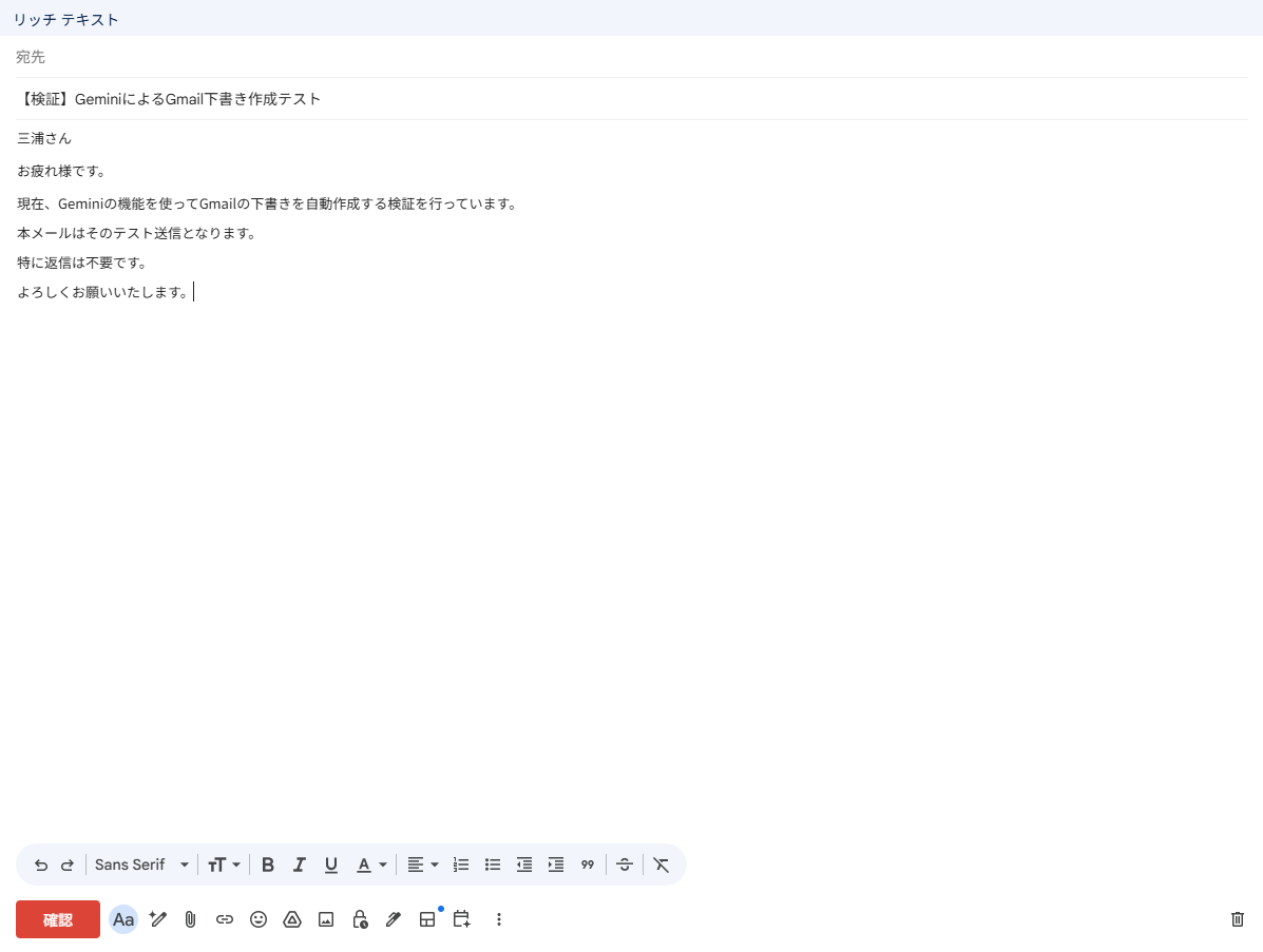 テーマは「GeminiでGmailの下書きを作成する検証メール」というものです。