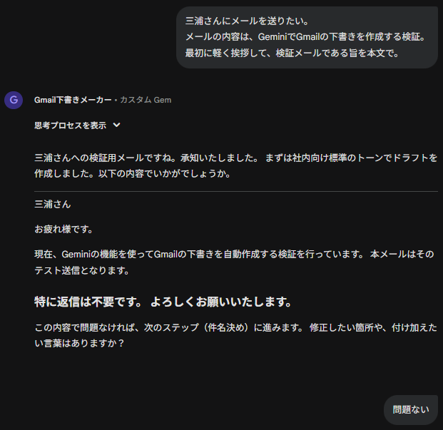 これを利用して、メールの内容が問題ないかの確認が済んだら、Geminiが「メール件名のみを送ってください。その後ボタンを押してね」と誘導するようなロジックにしたい。