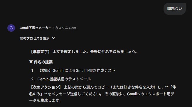 「問題ない」を受け取ったGemは、「Phase 2: 件名提案と誘導」に移行します。