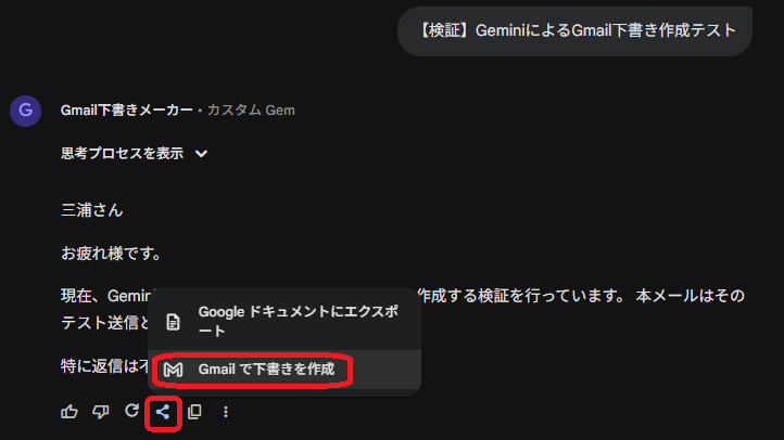 Geminiの「共有とエクスポート」で「Gmailで下書きを作成」という機能があるよね?
