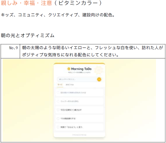 このように指示することで、単色だけでなく、色の組み合わせやコントラスト比、余白の構成といった「非言語的な情報」を一括で指示できるので、雰囲気を伝えるのに適しているといえます。