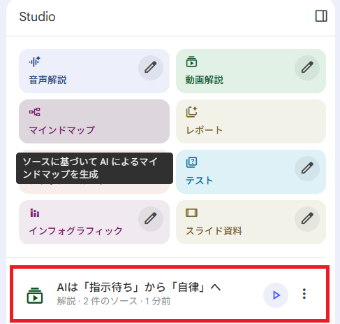 今回使用するNotebookLMの「動画解説」機能は、アップロードした資料の内容を動画形式で解説してくれるものです。