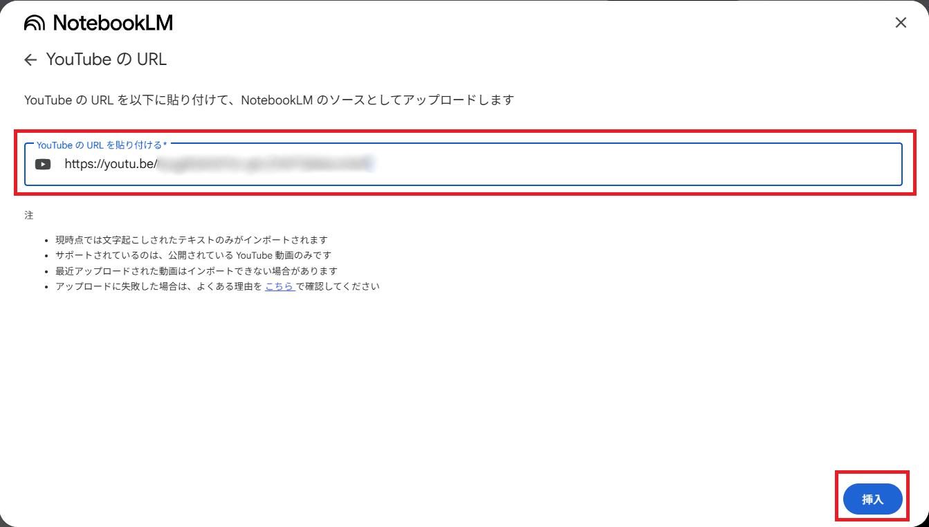 ここで、参考にしたい「プレゼンテーションの解説動画」のURLを貼り付け、「挿入」をクリックします。