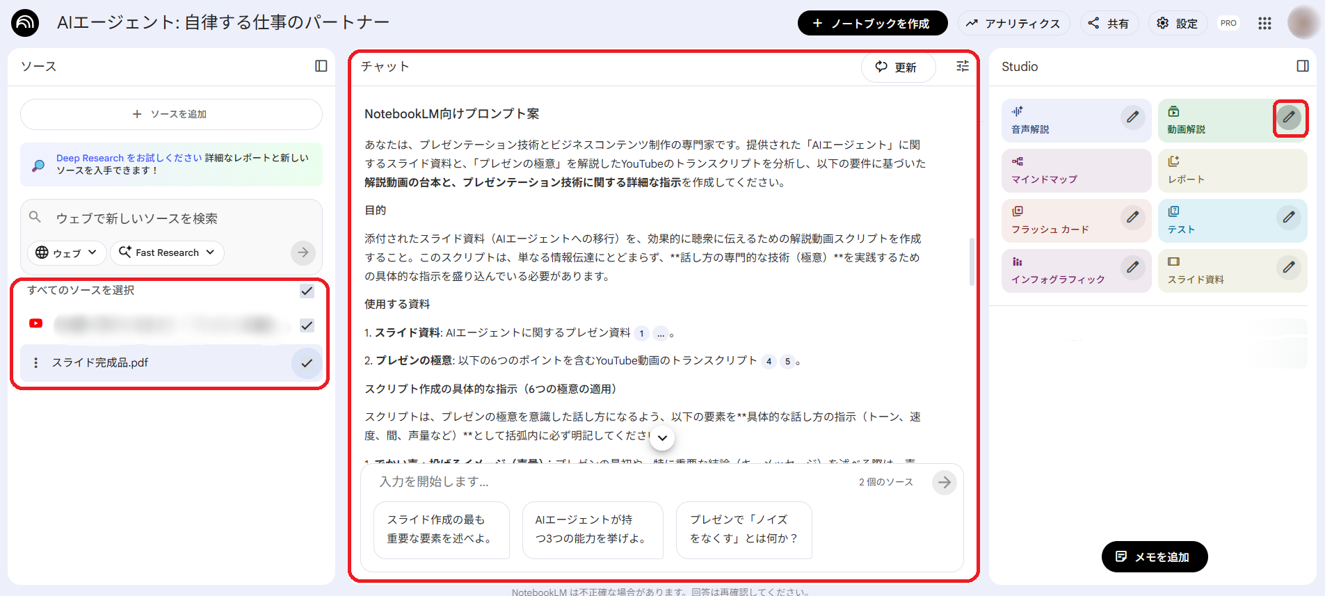 既にYouTubeのURLをデータソースとして追加しているので、プロンプトに「プレゼンの極意を意識した話し方をするよう…」という文言が含まれています。
