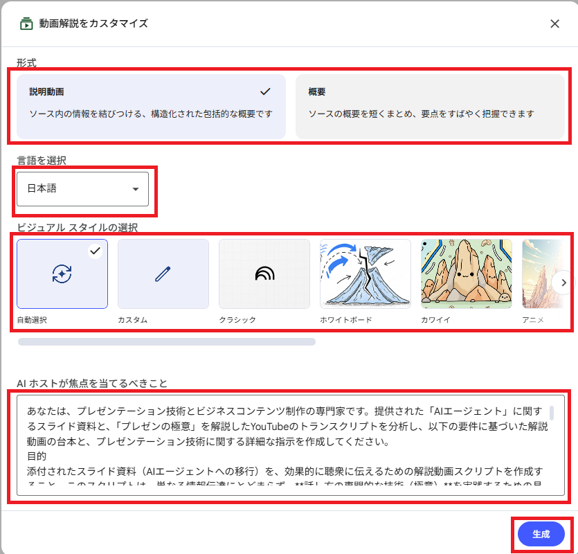 NotebookLMの右パネルから「動画解説」をクリックし、「形式」や「言語」、「ビジュアルスタイル」を選択したうえで、先ほどのプロンプトをペーストして、「生成」をクリックします。