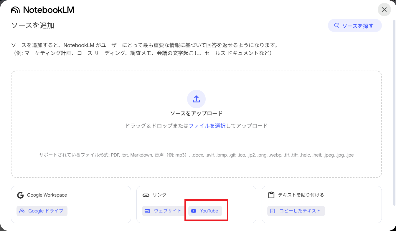 前回作成したPDF形式のスライド資料に加え、今回は「ソースを追加」から「リンク > YouTube」を選択します。