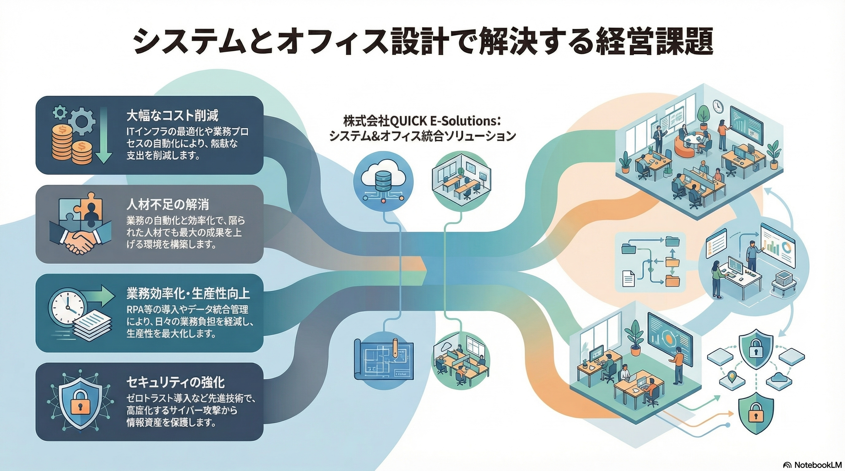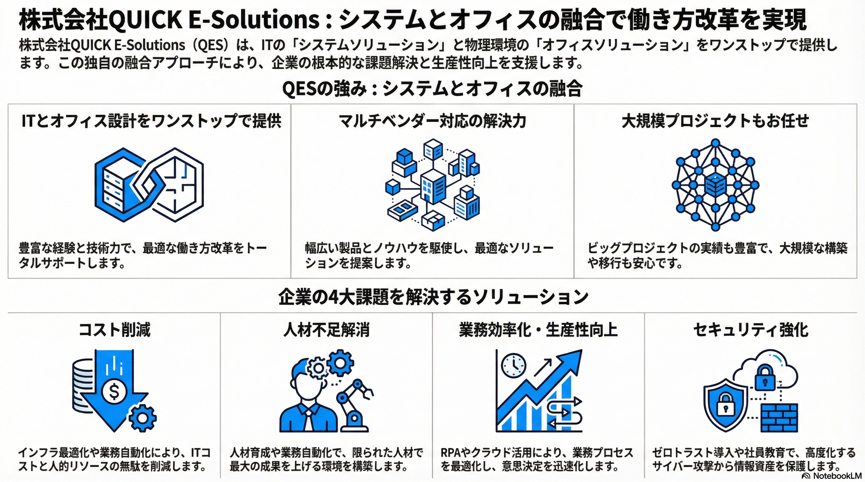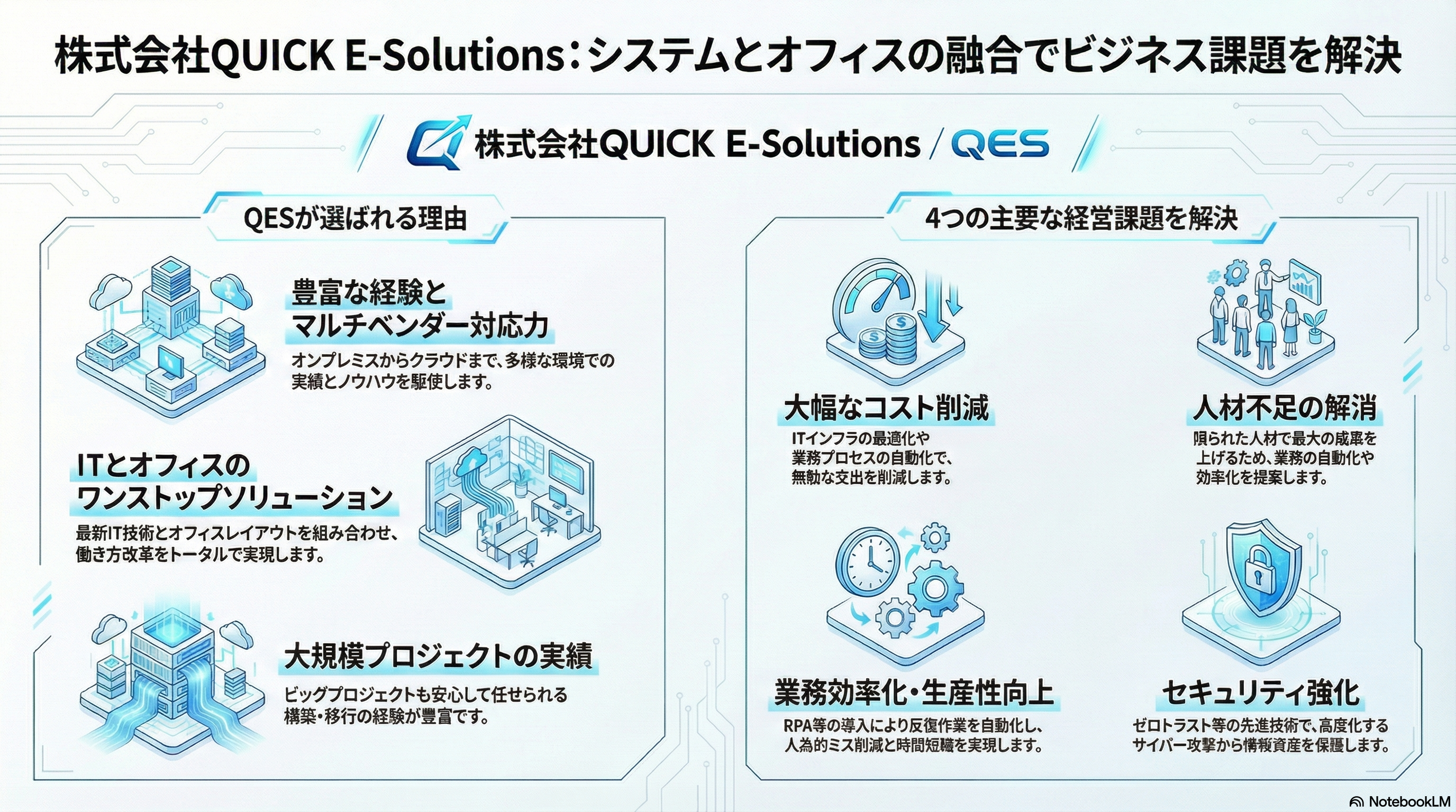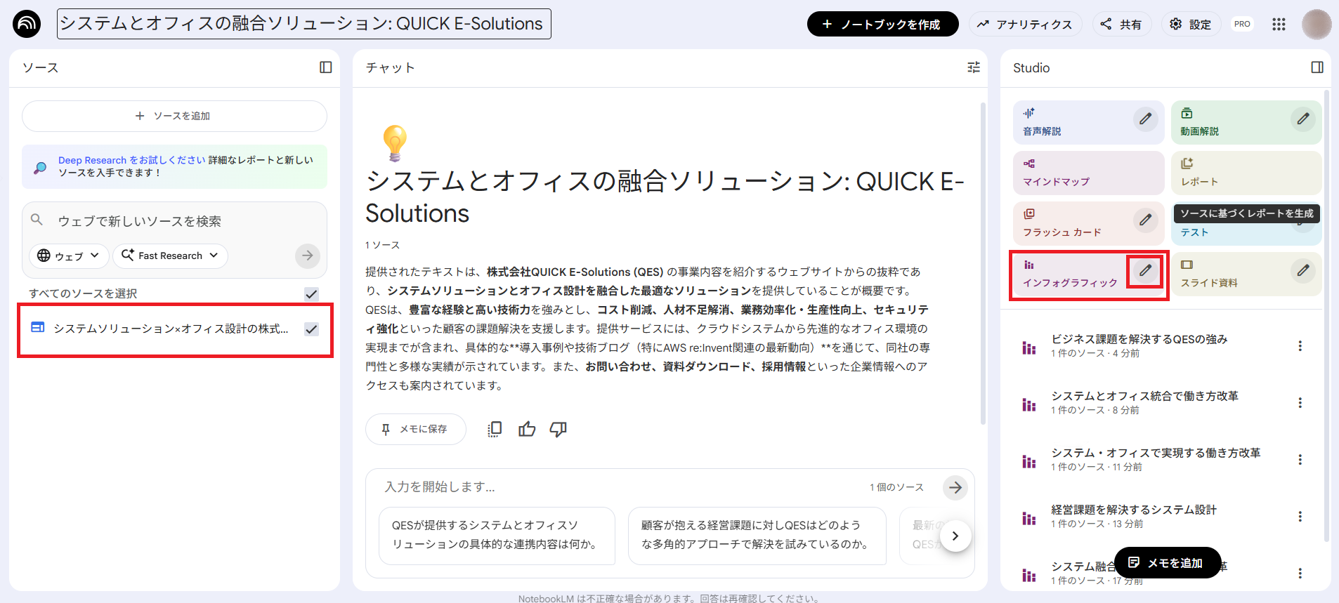 今回は、検証のために弊社(株式会社QUICK E-Solutions)のホームページをNotebookLMに読み込ませ、「弊社の強みやソリューション」をまとめたインフォグラフィックを作成します。