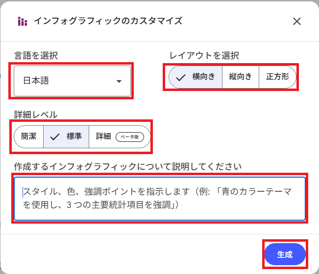 各種カスタマイズを設定し、「作成するインフォグラフィックについて説明してください」という欄にプロンプトを入力することで、デザインや強調ポイントを細かく指示することができます。