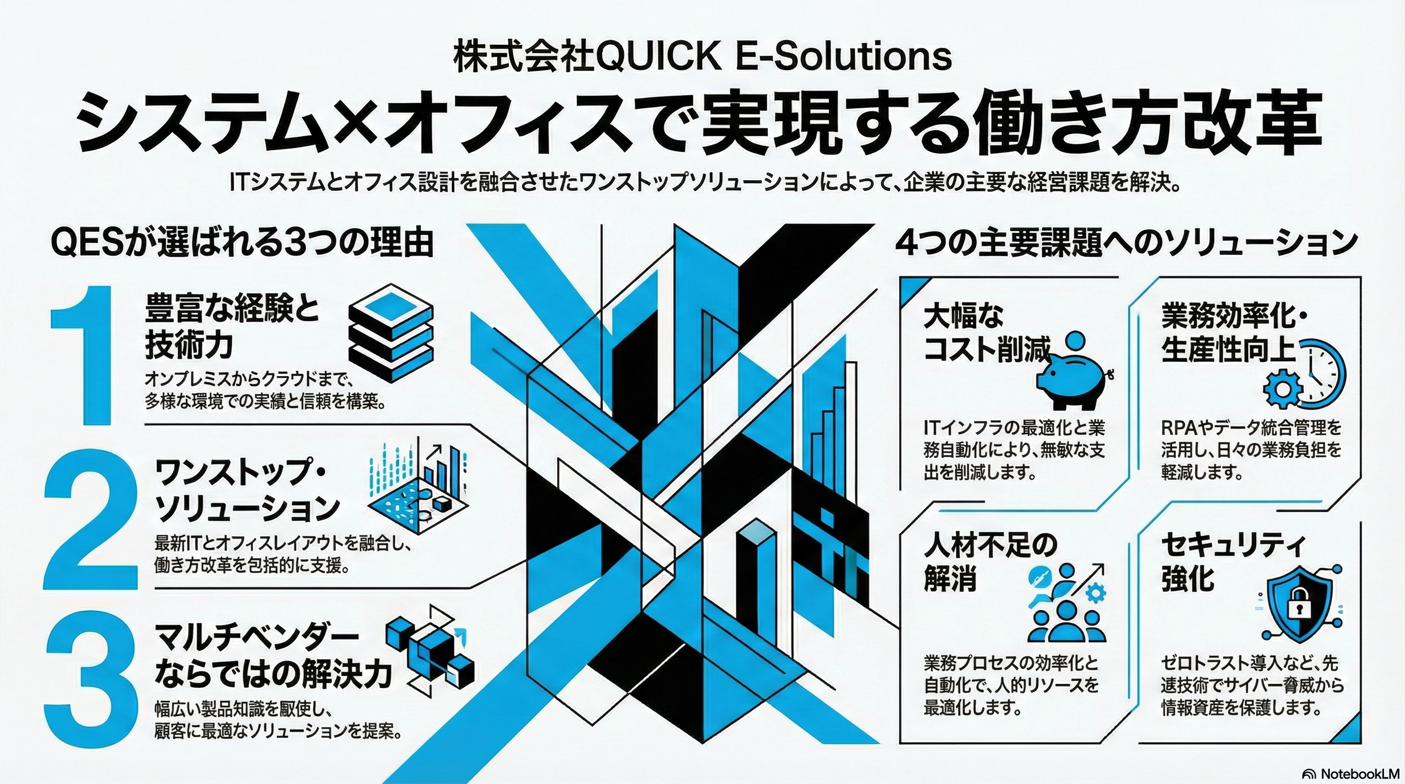 現代的なミニマルデザイン。背景は純白 (#FFFFFF) を使用し、テキストはコントラストの高い黒で可読性を最大化してください。アクセントカラーとして、鮮やかなシアンブルー (Electric Blue) をグラフや重要アイコンのみに限定して使用し、視線を誘導します。スイススタイルのようなグリッドレイアウトを採用し、太字のサンセリフ体で見出しを強調して、知的で整然とした印象に仕上げてください。社名を強調してください。