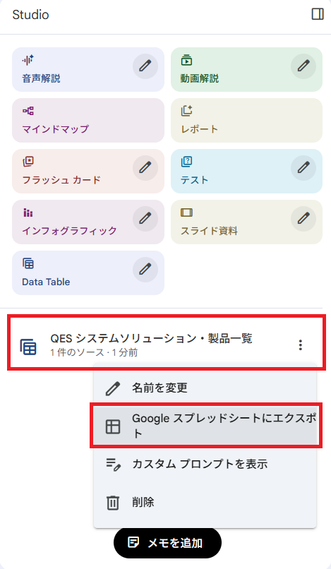 - エクスポート:生成された表のメニュー(三点リーダー)から「Google スプレッドシートにエクスポート」を選択。
