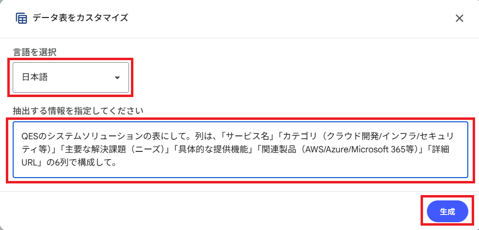 - プロンプト入力:「データ表をカスタマイズ」画面で、抽出したい項目(列)をプロンプトで指定し「生成」をクリック。