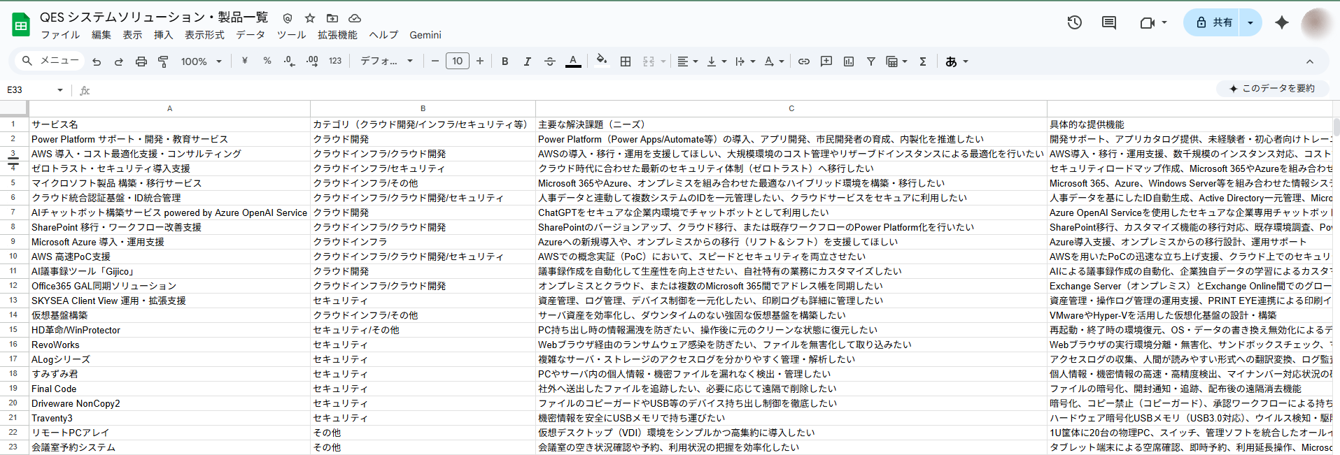 QESのシステムソリューションの表にして。列は、「サービス名」「カテゴリ(クラウド開発/インフラ/セキュリティ等)」「主要な解決課題(ニーズ)」「具体的な提供機能」「関連製品(AWS/Azure/Microsoft 365等)」「詳細URL」の6列で構成して。