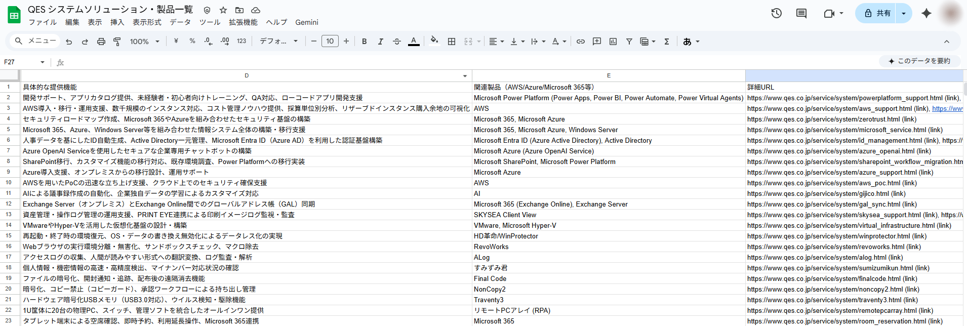 今回は、NotebookLMに弊社のシステムソリューション紹介ページ(https://www.qes.co.jp/strength/system.html)を読み込ませ、以下の条件で表を作成させます。