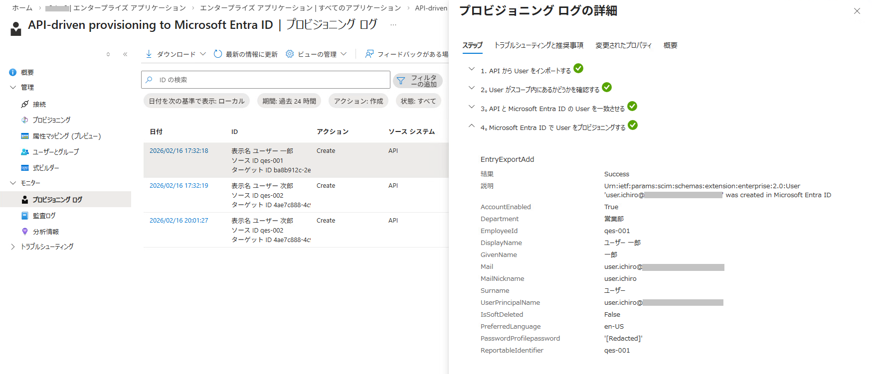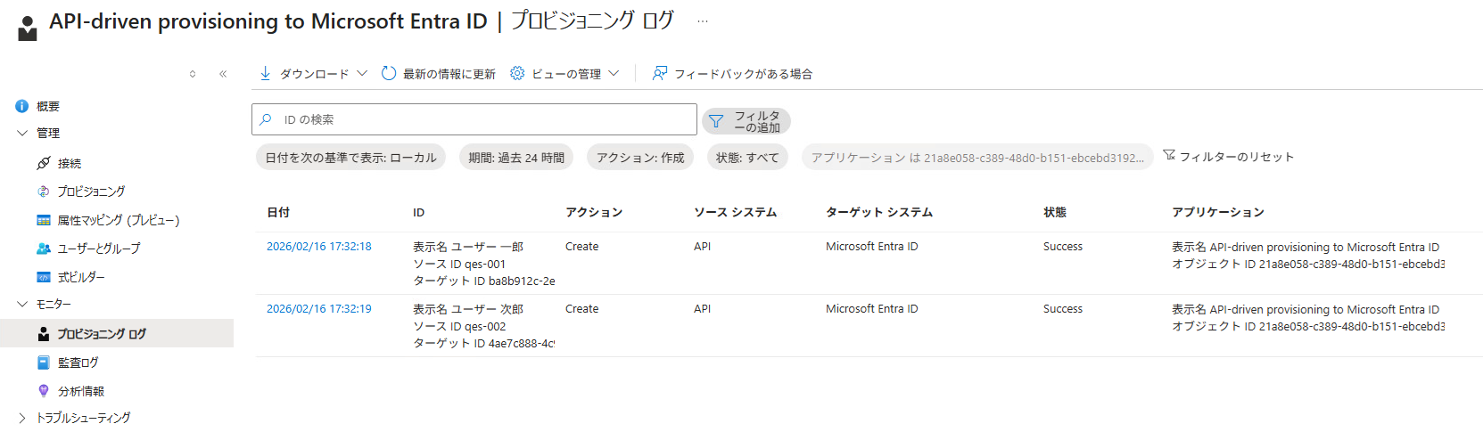 プロビジョニングの結果は、プロビジョニングログで確認できます。アクションが [Create] となっており、新規作成されたことがわかります。