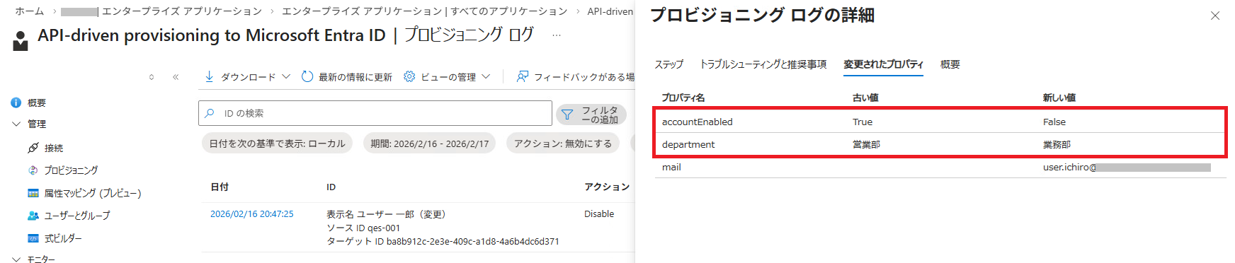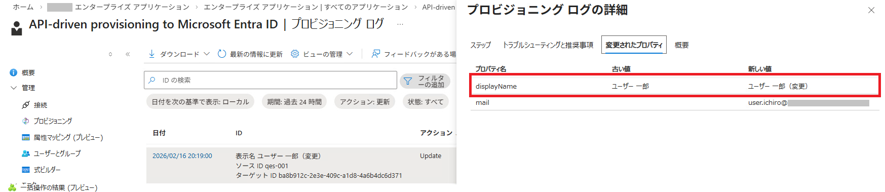 プロビジョニングログで、アクションが [Update] となっており、更新されたことがわかります。プロビジョニングログの詳細では、変更されたプロパティも確認できます。