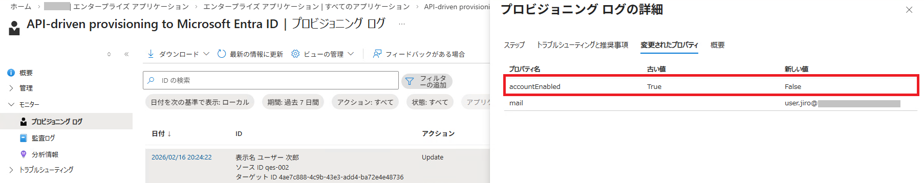 プロビジョニングログで、アクションが [Update] となっており、アカウントの状態が無効(accountEnabled が True ➡ False)に更新されたことがわかります。