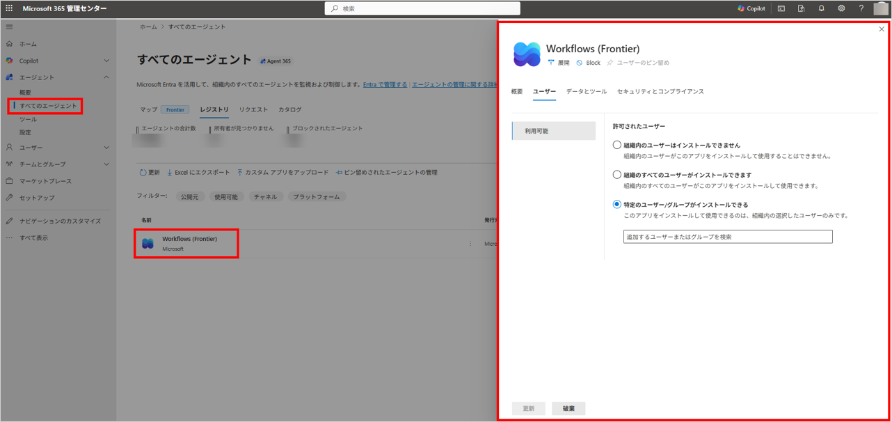Microsoft 365管理センターにて、「Workflows (Frontier)」へのアクセスを許可します。