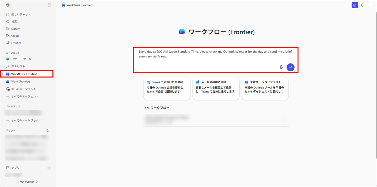 Microsoft 365 Copilotのチャット画面を開き、エージェント一覧から「Workflows (Frontier)」を選択します。
