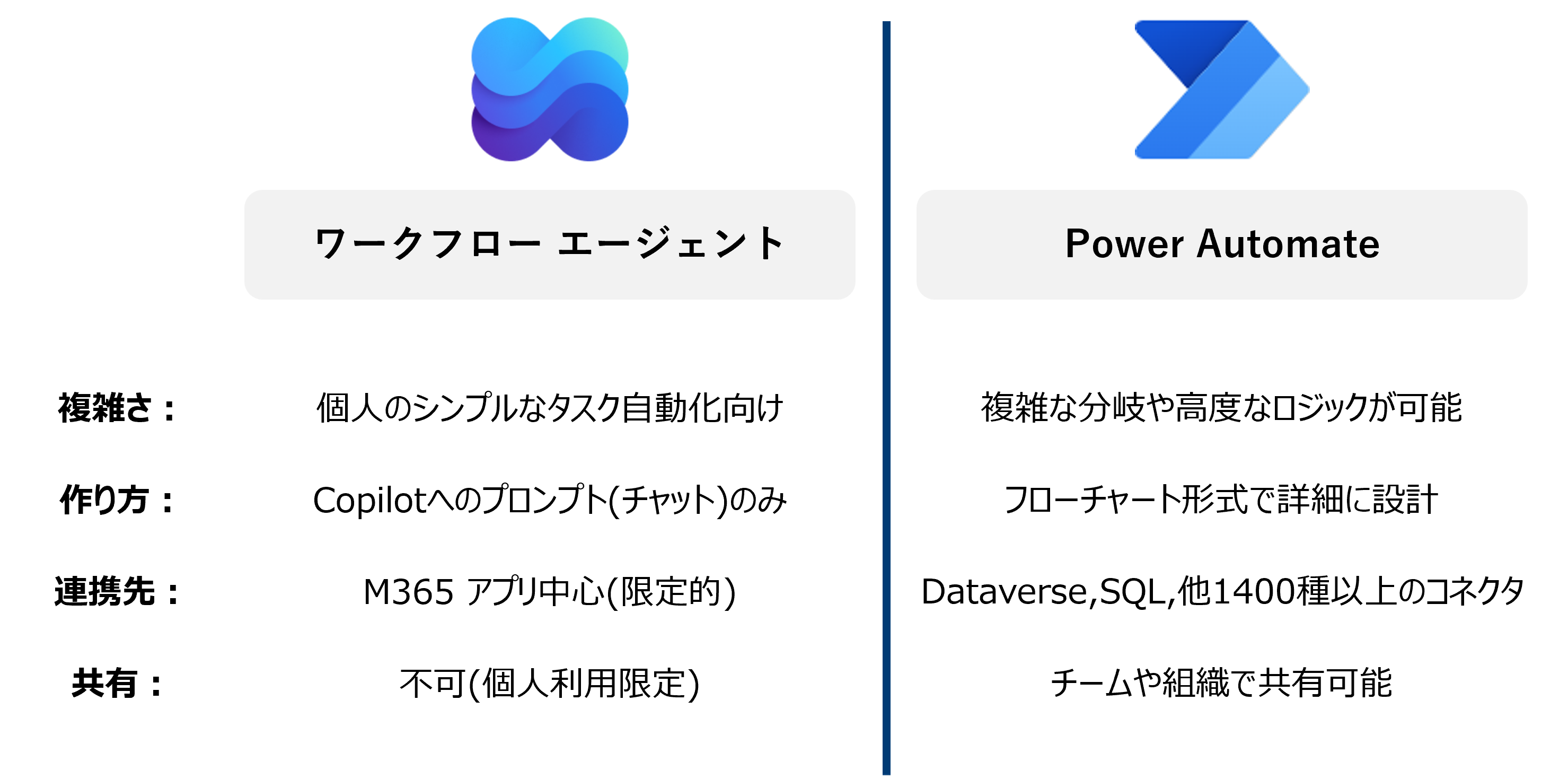 Copilot ワークフロー エージェントはPower Automateの技術をベースにしていますが、ターゲットと用途が異なります。