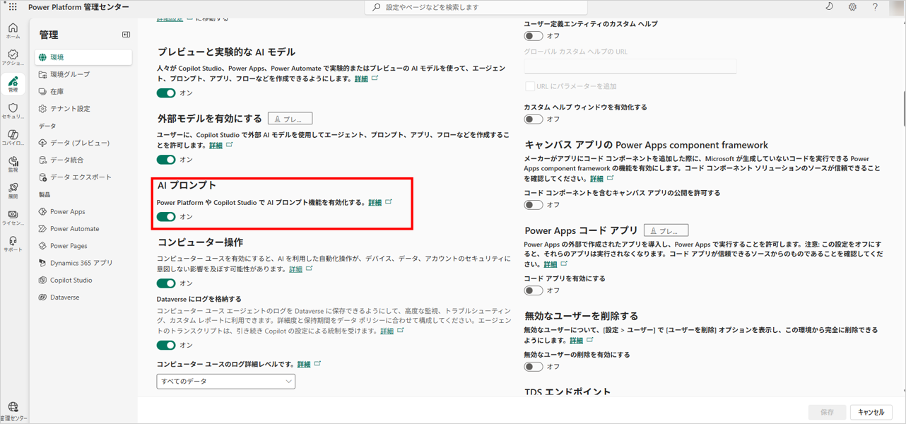 Power Platform管理センターにて、下記2点の事前作業が必要です。