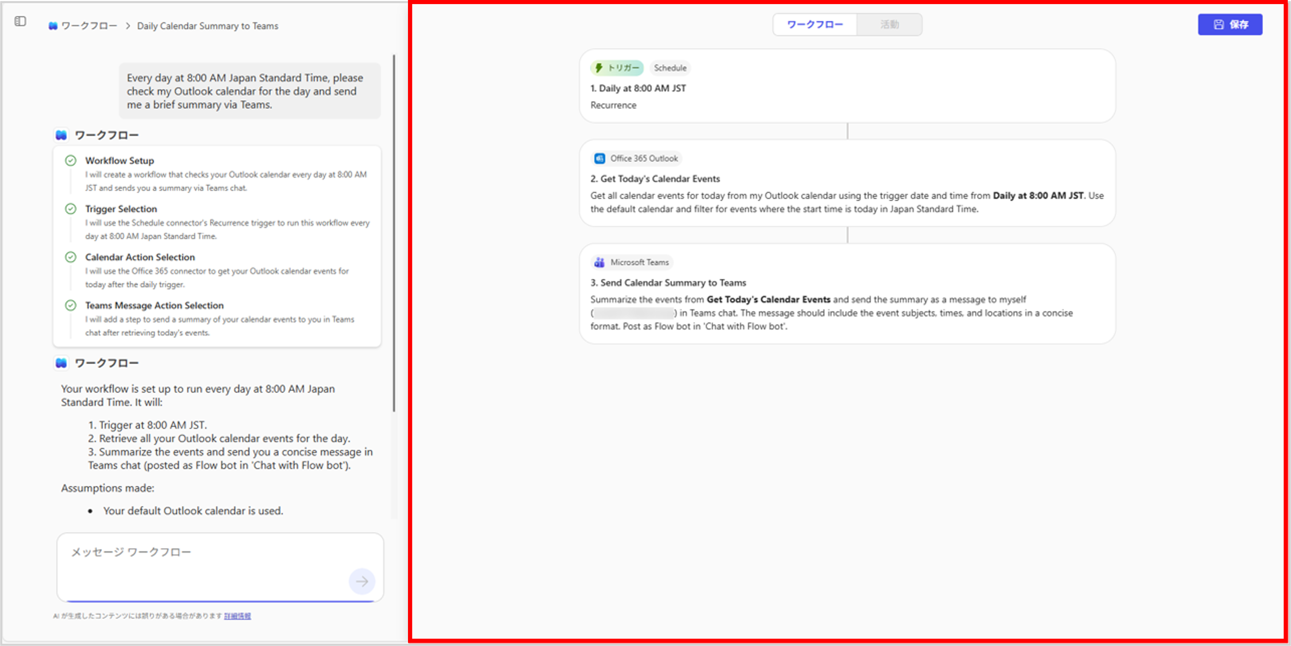 Copilotが提案した手順(トリガーやアクション)が正しいか確認し、問題なければ「保存」ボタンを押して、