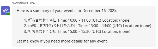 私の予定表を確認し、Teamsで簡単な概要を送信してくれるところまで無事に実装ができていました!