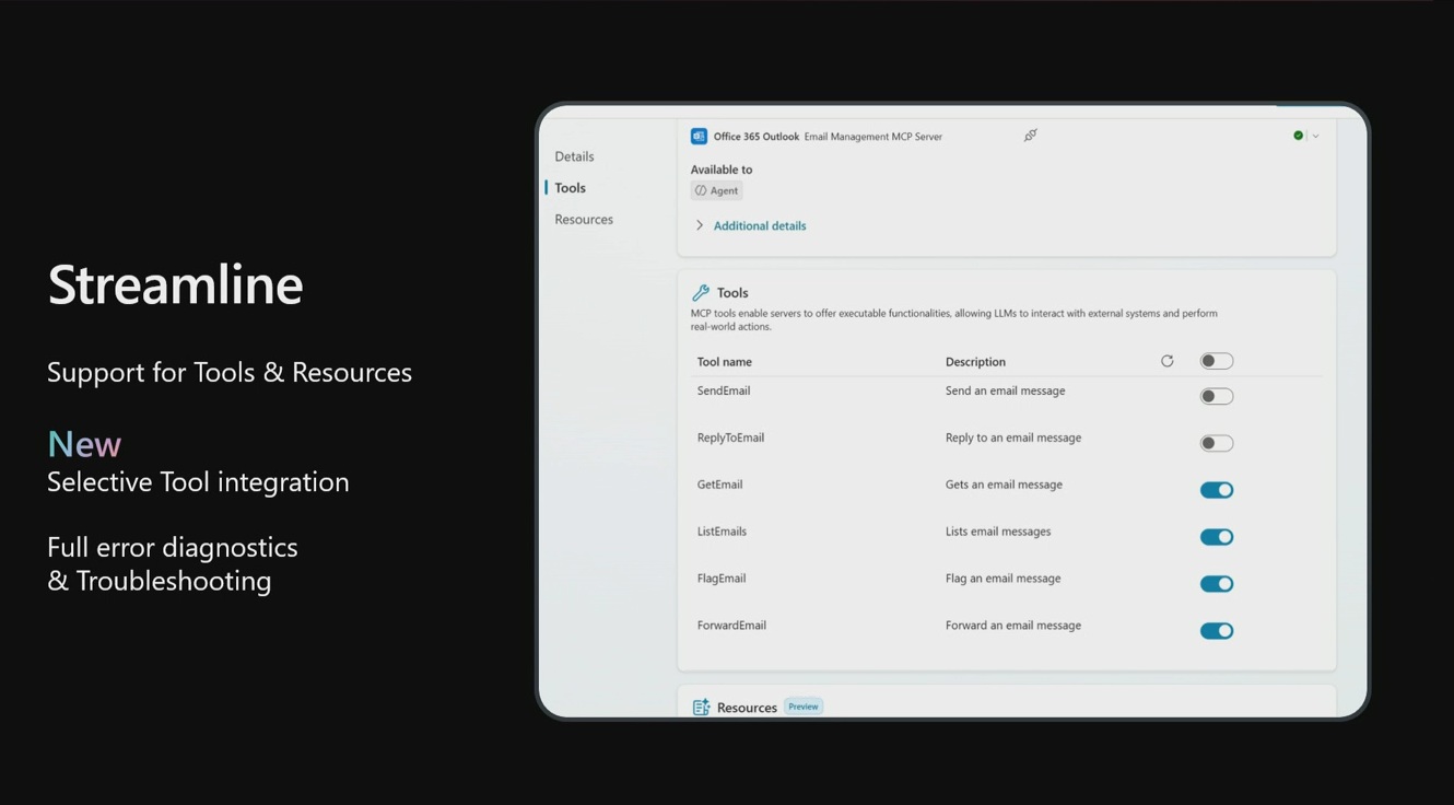 Selective Tool Integration: MCPサーバーに含まれるツール(例:「メール送信」「メール受信」など)の一覧が表示され、トグルスイッチで個別にON/OFFが可能です。